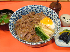 井月丼 地元産コシヒカリに、ごぼう、白髪ネギなど丹精こめて栽培された新鮮な野菜が肉の旨味を引き立て、さらに温泉卵がまろやかさをくわえます。 ★割烹食堂水車の井月丼 1,600円 |